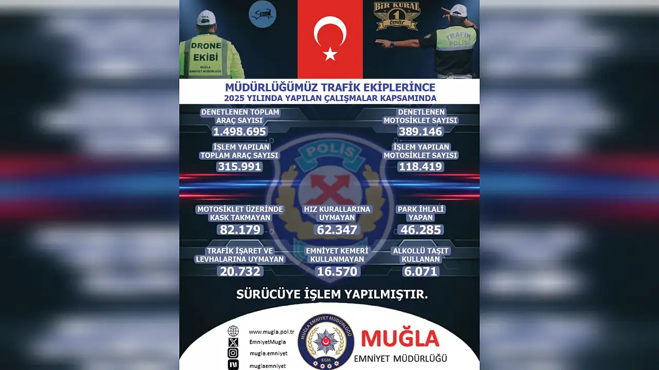 Muğla İl Emniyet Müdürlüğü, 2025 yılı içerisinde il genelinde trafik güvenliğini artırmak ve kazaları önlemek amacıyla kapsamlı denetimler gerçekleştirdi. Yapılan çalışmalar kapsamında toplam 1.498.695 araç denetlenirken, 315.991 araç ve sürücüsüne işlem uygulandı.