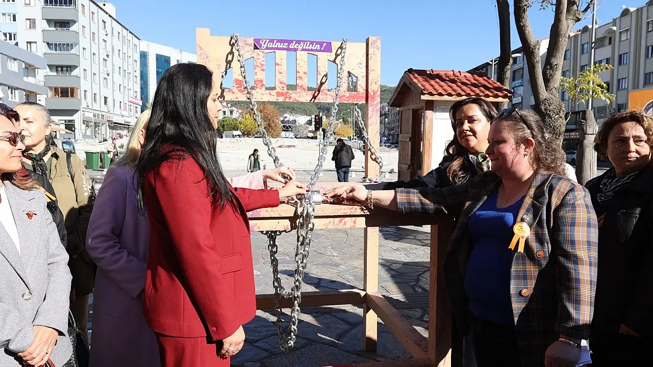 Kadına yönelik şiddete dikkat çekmek için 13 ilçede eş zamanlı yerleştirilen zincirli sandalyeler, güçlü bir farkındalık çağrısı oluşturdu.