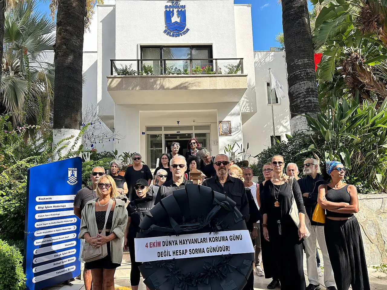 “4 Ekim hayvanları koruma günü değil, hesap sorma günü” yazılı siyah bir çelenk hazırlayan grup, Bodrum Belediyesi önüne gelerek çelengi belediye kapısına bıraktı.