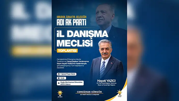 AK Parti Muğla İl Başkanlığı tarafından düzenlenecek Genişletilmiş İl Danışma Meclisi Toplantısı, 1 Şubat Pazar günü Genel Başkan Yardımcısı Hayati Yazıcı'nın katılımıyla gerçekleştirilecek.
