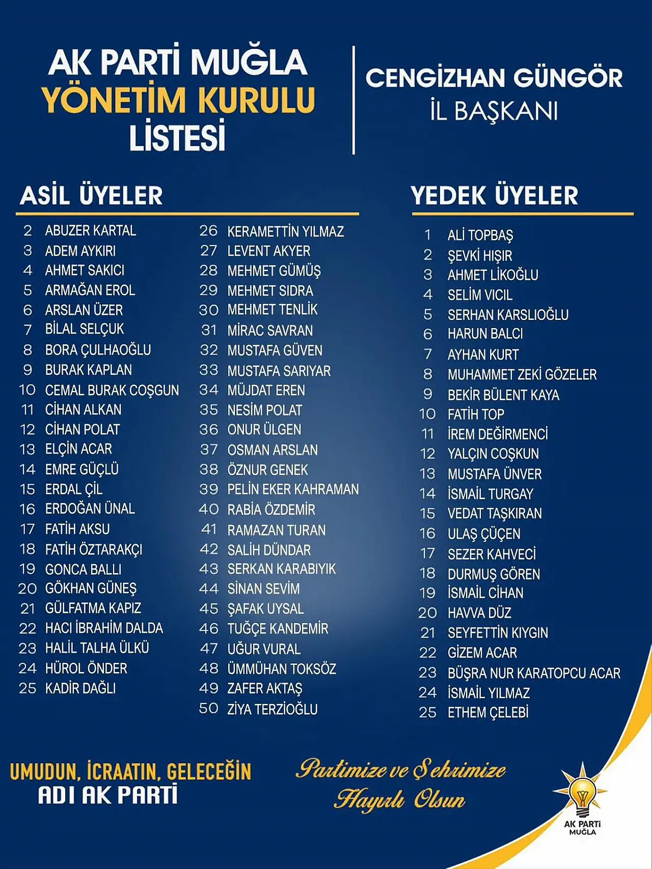 AK Parti Muğla'da yeni yönetim kurulu listesi kamuoyuyla paylaşılırken Gençlik Kolları'nda Miraç Savran ve Zafer Aktaş'ın yeni görevleri duyuruldu.