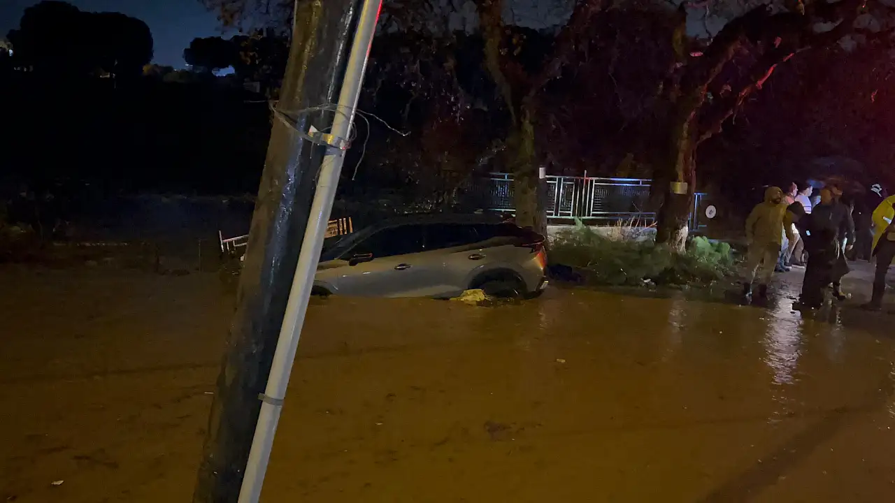 Akşam saatlerinde etkili olan sağanak yağış Bodrum'u vurdu Bitez Palamut Sokak'ta bir otomobil sel sularına kapılarak dere yatağına sürüklendi.