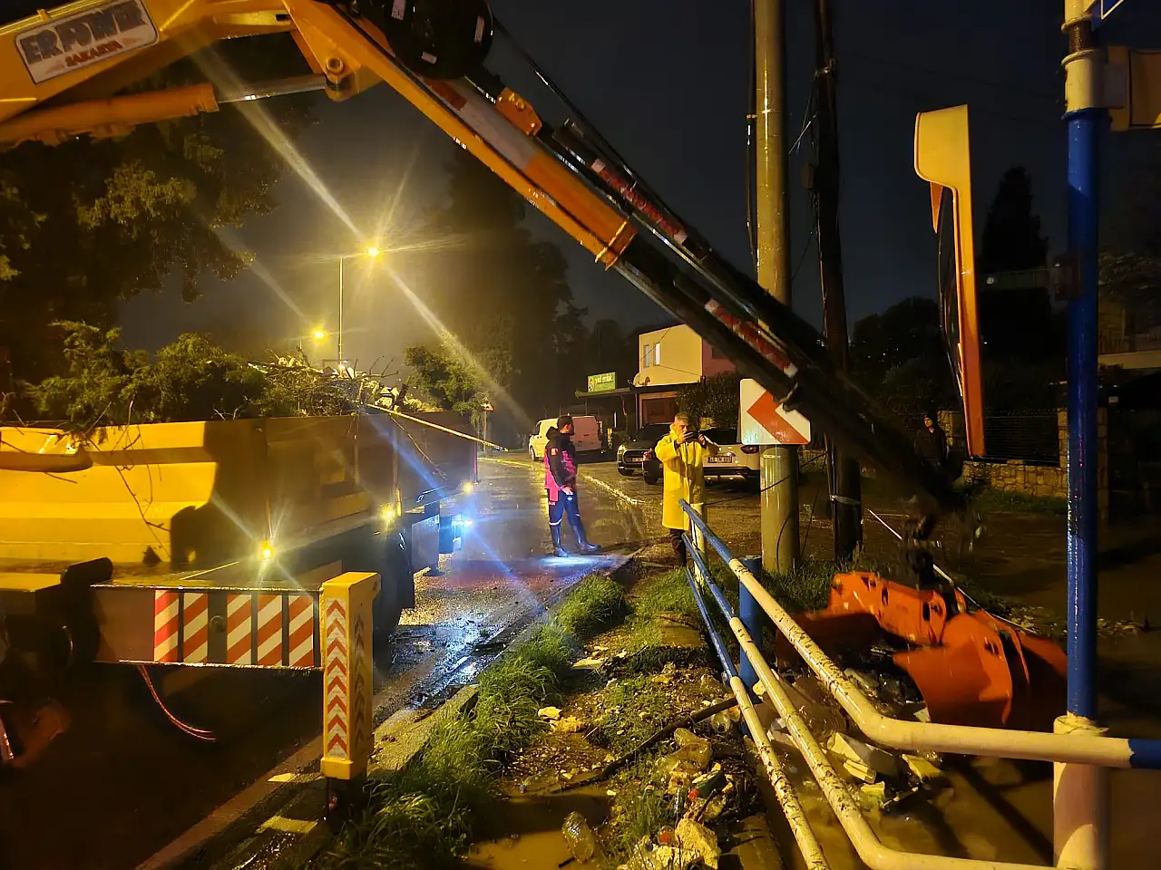 Şiddetli yağış nedeniyle bazı dere yataklarının çöp ve atıklarla dolu olması, taşkın riskini artırdı. Bodrum Belediyesi ekipleri, gece saatlerinde tıkanan noktalarda yoğun bir çalışma yürüterek suyun tahliyesi için müdahalede bulundu. Ekiplerin yağmur altında çalışmalarını sürdürdüğü anlar kameralara yansıdı.