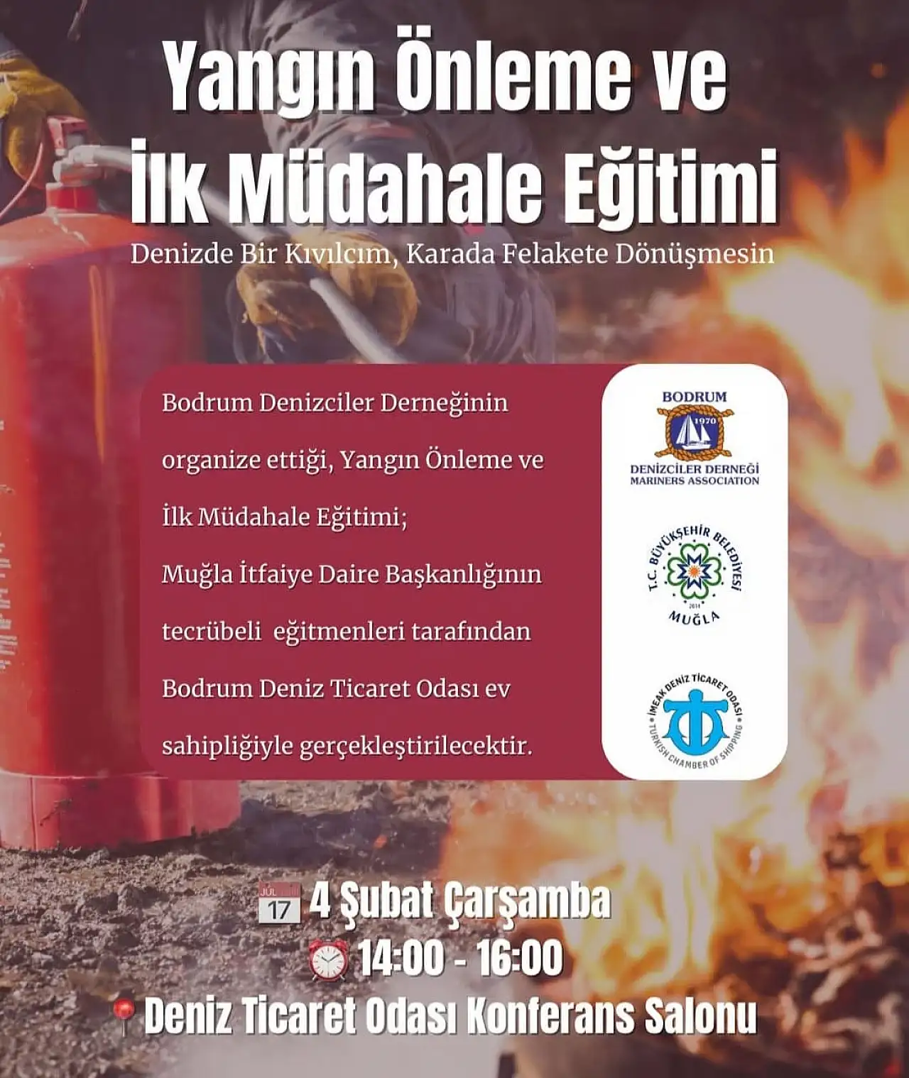 Bodrum'da geçtiğimiz sezon yaşanan tekne yangınlarının ardından, denizcilikte yangın güvenliğine dikkat çekmek amacıyla Muğla Büyükşehir Belediyesi, Deniz Ticaret Odası Bodrum Şubesi ve Bodrum Denizciler Derneği iş birliğiyle 4 Şubat'ta 'Yangın Önleme ve İlk Müdahale Eğitimi' düzenlenecek.