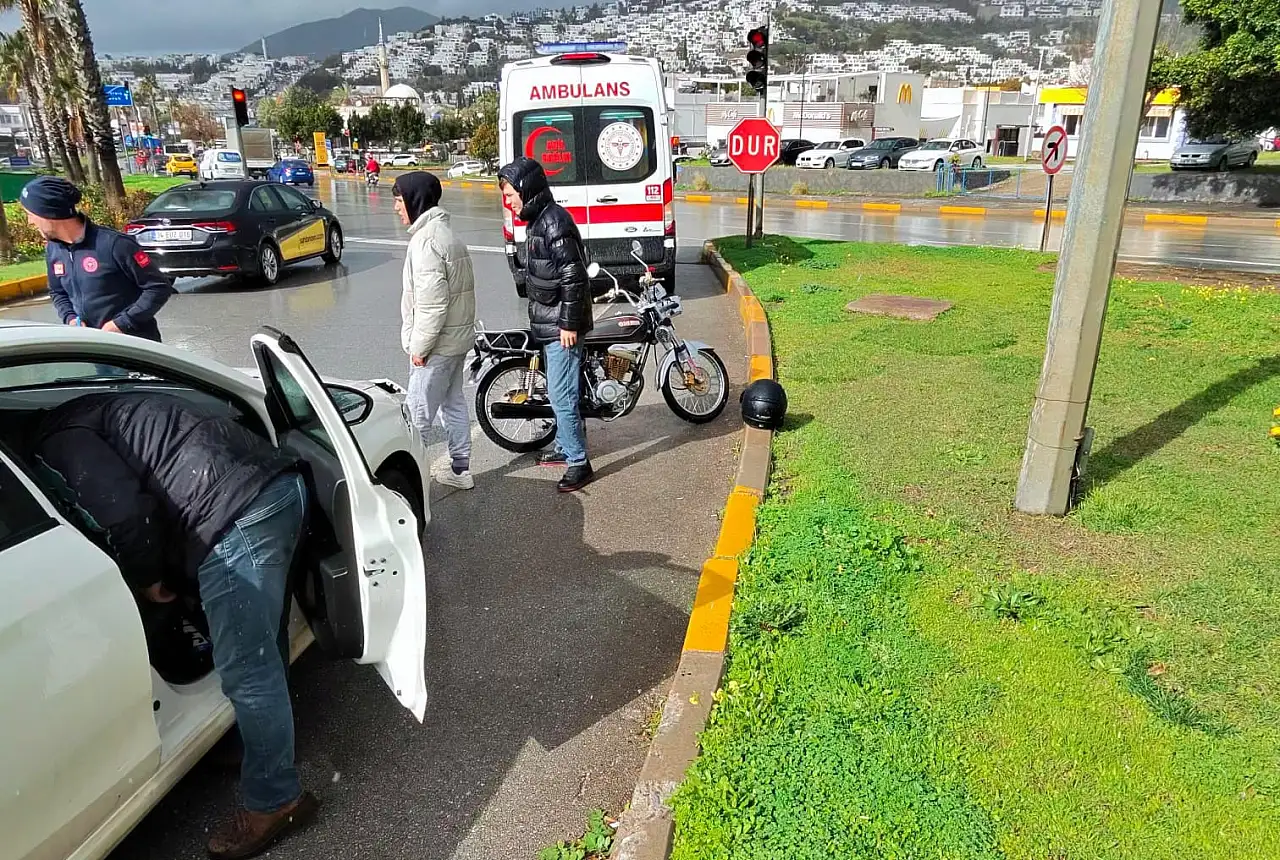Bodrum Gümbet Kavşağı'nda meydana gelen kazada, iddiaya göre kırmızı ışıkta geçen 16 yaşındaki ehliyetsiz motosiklet sürücüsü otomobille çarpışarak yaralandı.