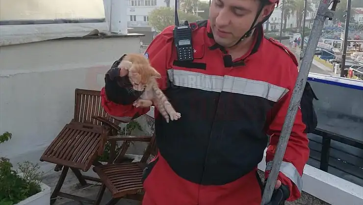 Çarşı Mahallesi Neyzen Tevfik Caddesi'nde, kedi yavrusunun bir marketin tabelası ile duvar arasına sıkıştığı ve burada mahsur kaldığı ihbarını alan Muğla Büyükşehir Belediyesi Bodrum İtfaiye Grup Amirliği ekipleri, belirtilen adrese gitti.