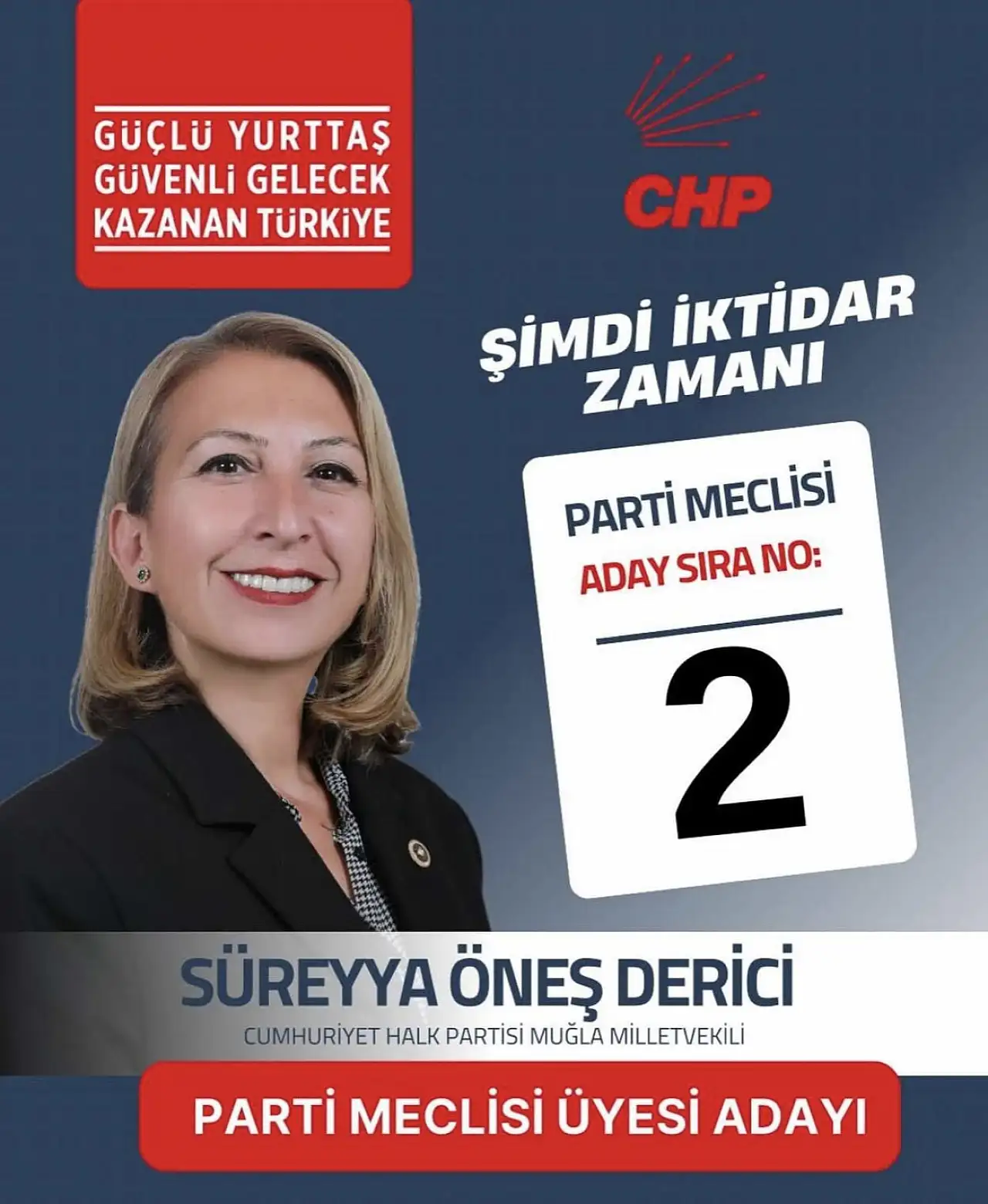 Kesinleşen sonuçlara göre, Muğla milletvekili listesinde 2 numarada yer alan Süreyya Öneş Derici, 967 oyla CHP Parti Meclisi’ne seçildi. Derici, PM’de yer alarak partinin politika belirleme sürecinde aktif rol üstlenen isimlerden biri olacak.