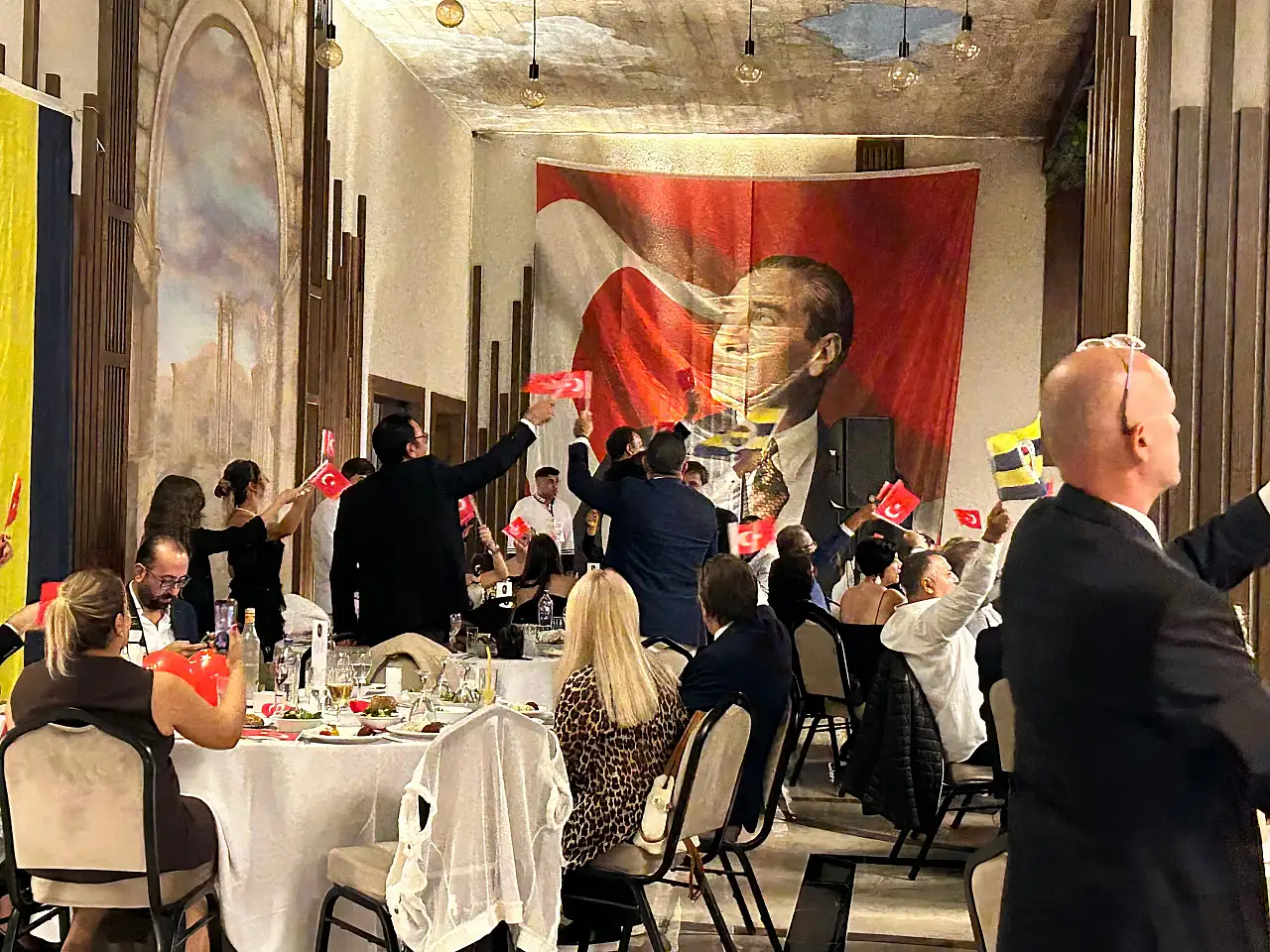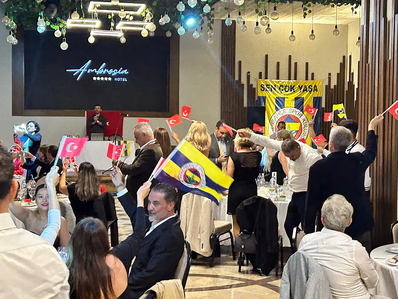 Gece boyunca Türk bayrakları ve Fenerbahçe flamalarıyla süslenen salonda, katılımcılar hep bir ağızdan İstiklal Marşı ve 10. Yıl Marşını söyledi.