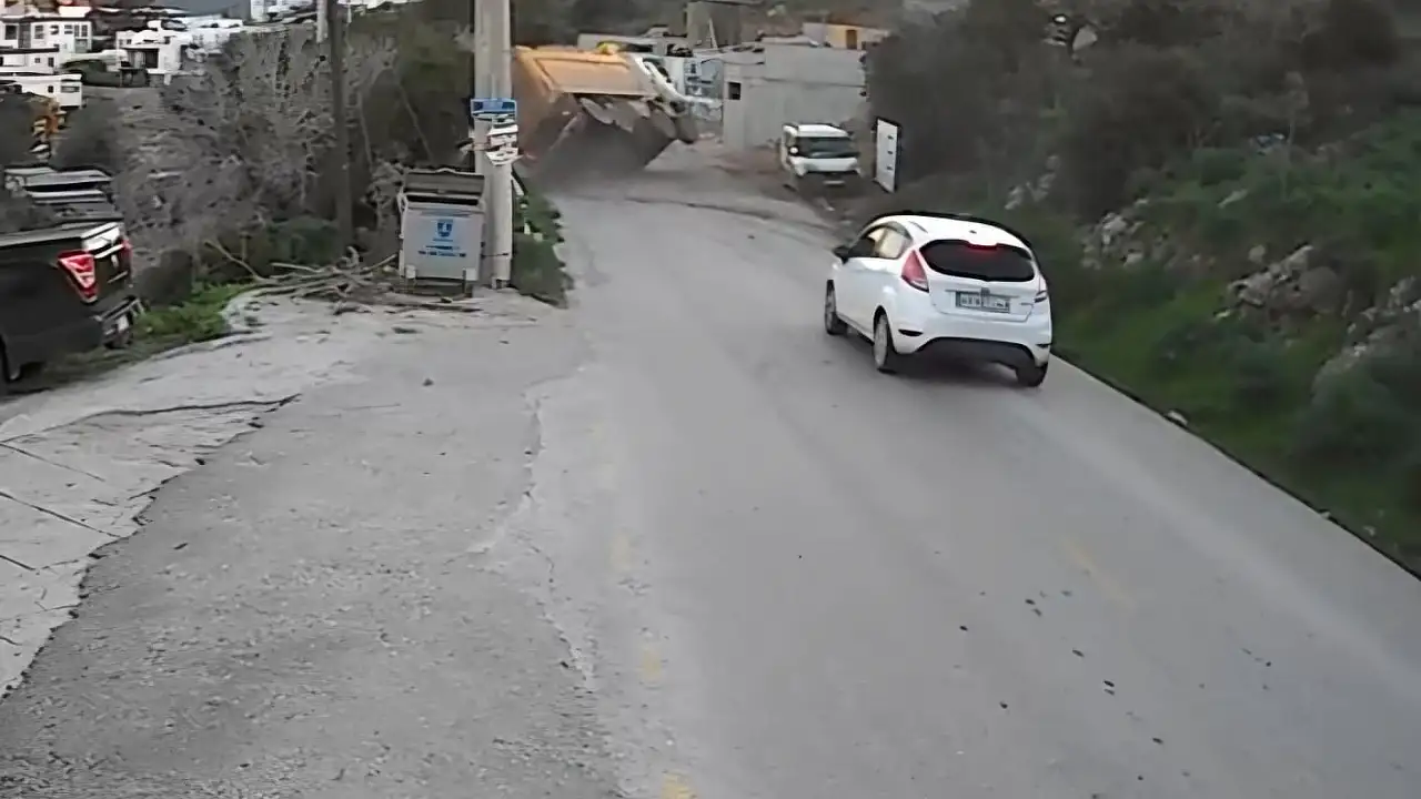 Bodrum'da yol kenarındaki çukura giren hafriyat kamyonunun devrilmesi sonucu 1 kişi yaralanırken, kaza anı güvenlik kameralarına yansıdı.