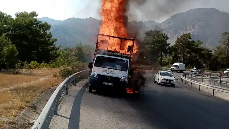 BODRUM HABER - Fethiye ilçesinde seyir halinde aniden alev alarak yanan bir kamyonet itfaiye ekipleri tarafından söndürüldü.Edinilen bilgiye göre olay, Göcek Mahallesi D 400 Karayolu Belen Pınar Mevkiinde meydana geldi.