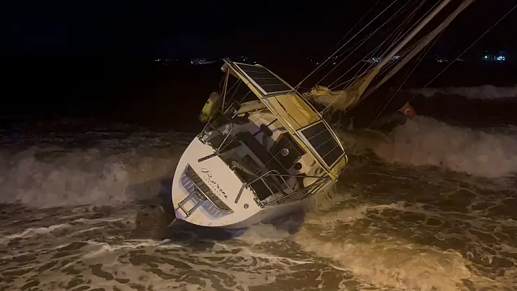 Etkili olan kuvvetli fırtına, kıyıda demirli milyonlarca lira değerindeki yelkenli tekneyi karaya sürükledi.