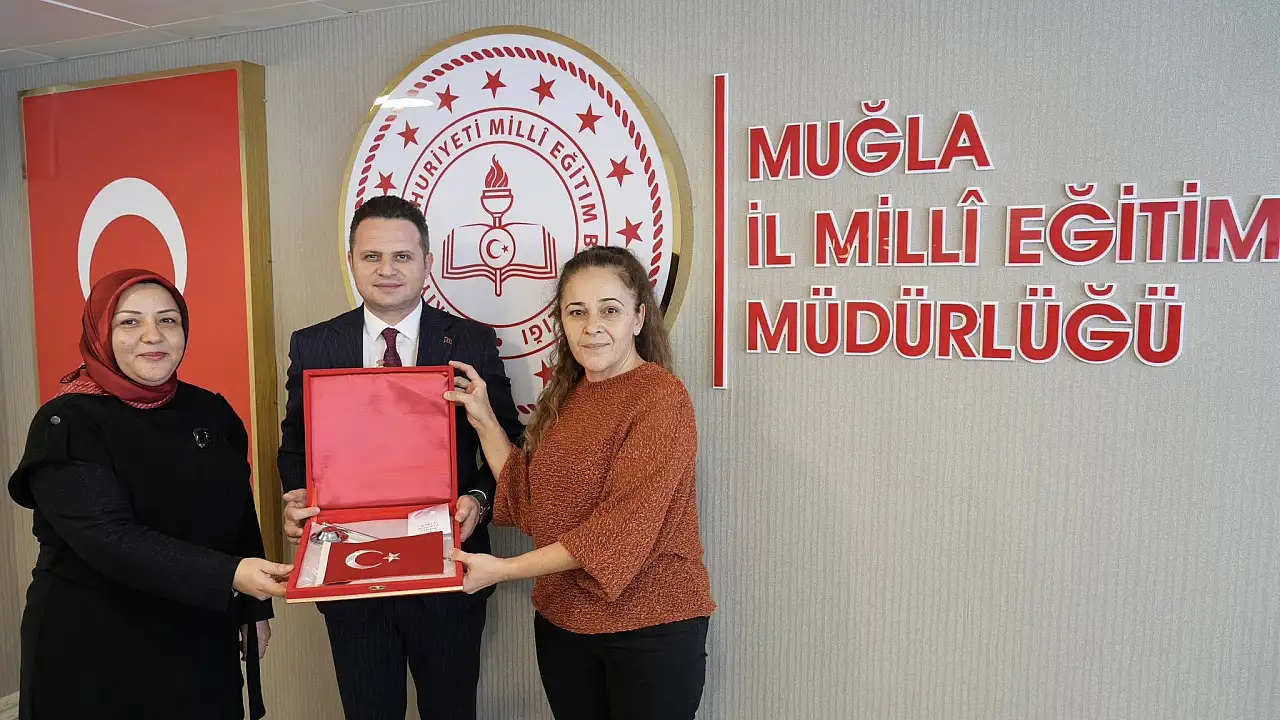 Muğla Olgunlaşma Enstitüsü tarafından 'Bayrak Sevgisi' teması kapsamında, geleneksel dival işi tekniğiyle el emeğiyle hazırlanan Türk Bayrağı İl Millî Eğitim Müdürü Emre Çay'a takdim edildi.