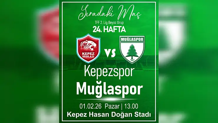 FF 2. Lig 24. hafta maçında Muğlaspor, 1 Şubat Pazar günü saat 13.00'te Kepez Hasan Doğan Stadı'nda Kepezspor'a konuk olacak. Ligde üst sıraları hedefleyen yeşil-beyazlı ekip, deplasmandan 3 puanla dönmeyi amaçlıyor.