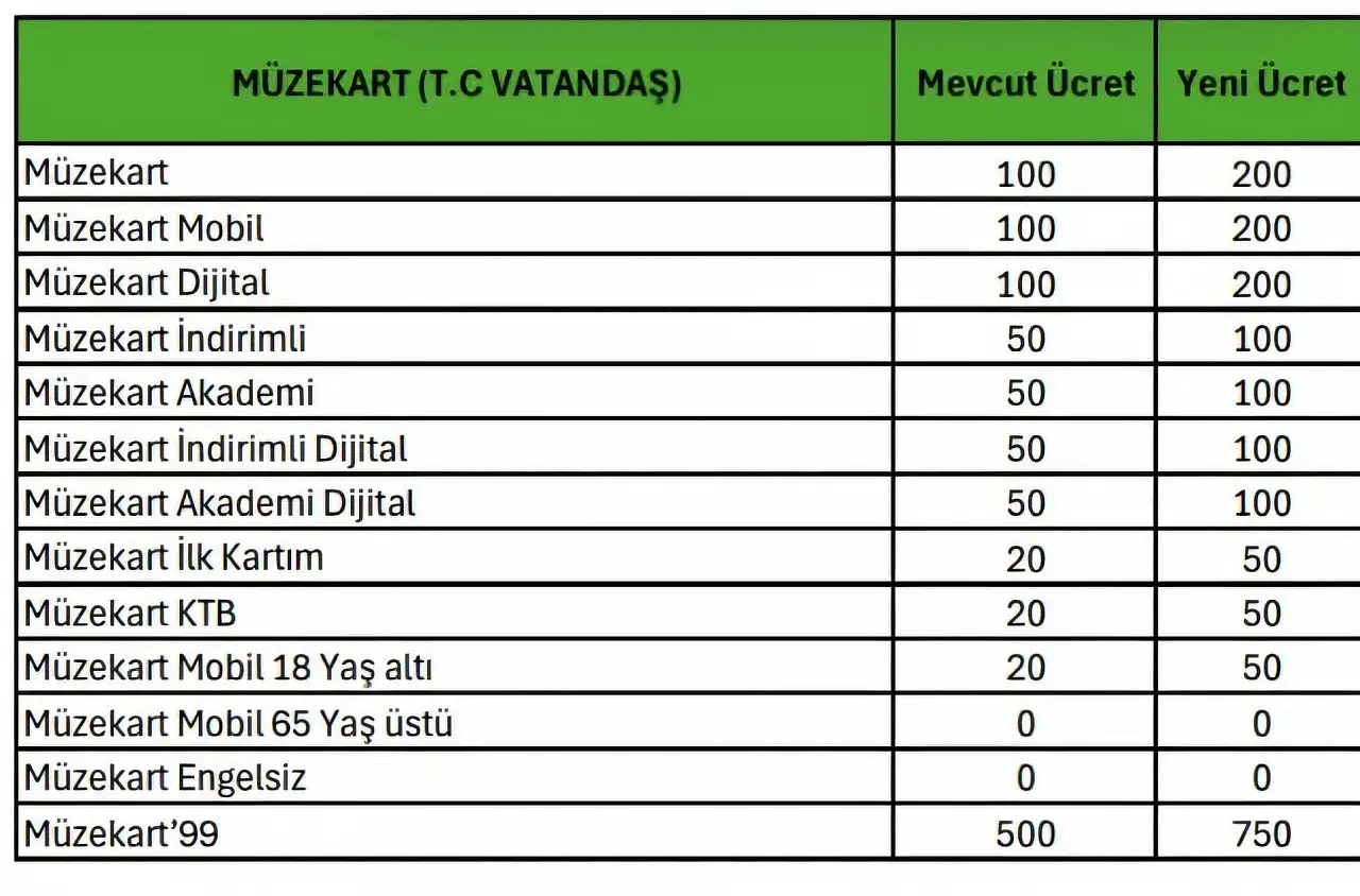 Yeni tarifeye göre Müzekart, Müzekart Mobil ve Müzekart Dijital ücretleri 200 TL’ye yükseltildi. İndirimli Müzekart ile akademik kart ücretleri ise 100 TL olarak belirlendi. Ayrıca “İlk Kartım”, KTB ve mobil kart kategorilerinde de fiyat artışı yapıldı.