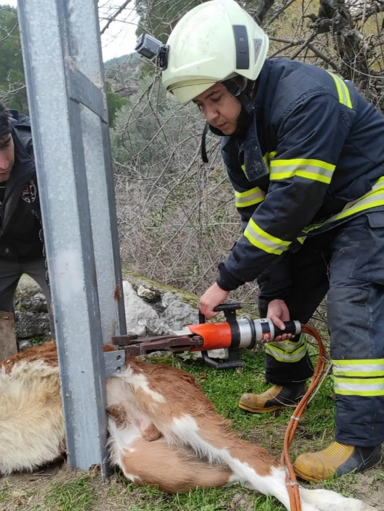 İhbar üzerine bölgeye Muğla Büyükşehir Belediyesi İtfaiye Daire Başkanlığı ekipleri sevk edildi. Kısa sürede olay yerine ulaşan ekipler, buzağının zarar görmemesi için dikkatli bir çalışma yürüttü. Aydınlatma direğindeki demirlerin kontrollü şekilde genişletilmesiyle sıkışan buzağı bulunduğu yerden çıkarıldı.