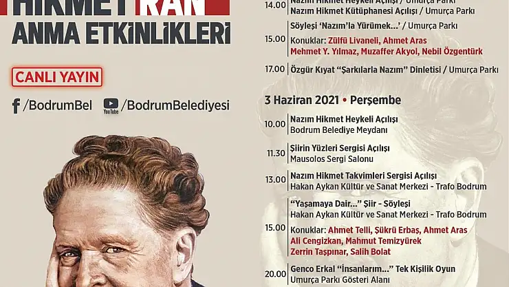Kültür ve sanatla yoğrularak Bodrum'a yakışır bir etkinlik olması için günler öncesinden hazırlıklarına başlanan anma etkinlikleri programı 2 Haziran günü saat 14.00'de Umurça Parkı'ndaki Nazım Hikmet heykeli açılışı ile başlayacak. Park içindeki kütüphaneye Nazım Hikmet'in adının verilmesinin ardında düzenlenecek söyleşiye, Zülfü Livaneli, Mehmet Y.Yılmaz, Muzaffer Akyol, Nebil Özgentürk ve Belediye Başkanı Ahmet Aras katılacak. 2 Haziran günü saat 15.00'da başlayacak olan "Nazım'la Yürümek" isimli söyleşi, belediye sosyal medya hesaplarından da canlı olarak yayınlanacak.