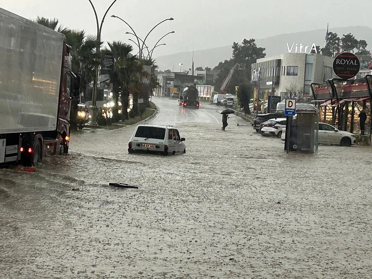 Bir alışveriş merkezi önünde şiddetli yağmur ve sel etkisini gösterince iki araç tamamen sular altında kaldı. Aniden bastıran sağanak, bölgedeki trafik akışını durma noktasına getirirken sürücüler büyük panik yaşadı.Kısa sürede yolların göle dönmesiyle birlikte alışveriş merkezi çevresinde biriken sel suları, iki aracı tamamen kapladı. Çevredeki vatandaşlar, araçların suya gömülüşünü endişeyle izlerken durumu ihbar etti. Yağışların, Cumartesi akşam saatlerinde etkisini kaybetmesi bekleniyor. Kuvvetli yağışın sebep olabileceği ani sel, su baskını, heyelan, yıldırım, yerel dolu yağışı, yağış anında kuvvetli rüzgar ve kısa süreli fırtına ile ulaşımda aksamalar gibi olumsuzluklara karşı dikkatli ve tedbirli olunmalıdır" denildi.