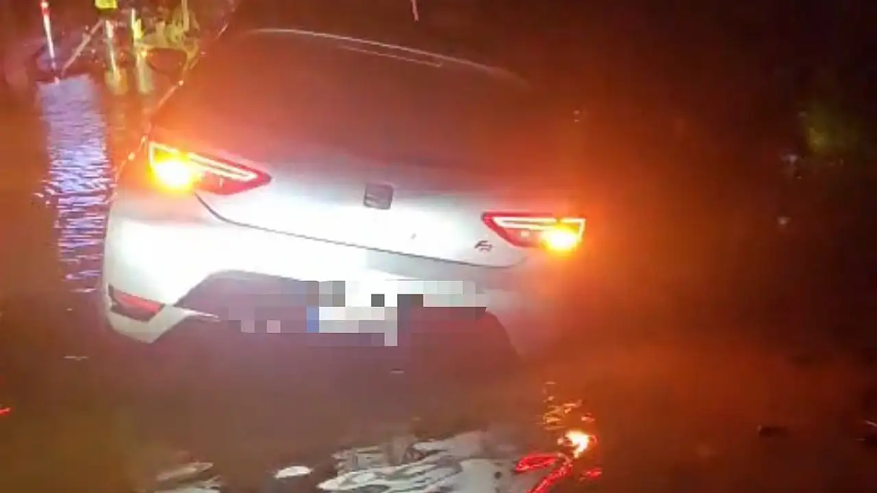 Kaynar Kavşağı'ndaki zincirleme kazayı takip eden Sıcak Haber muhabiri, suyla dolu yol kenarında aracının yan yatmasına rağmen çekimlerine devam etti.