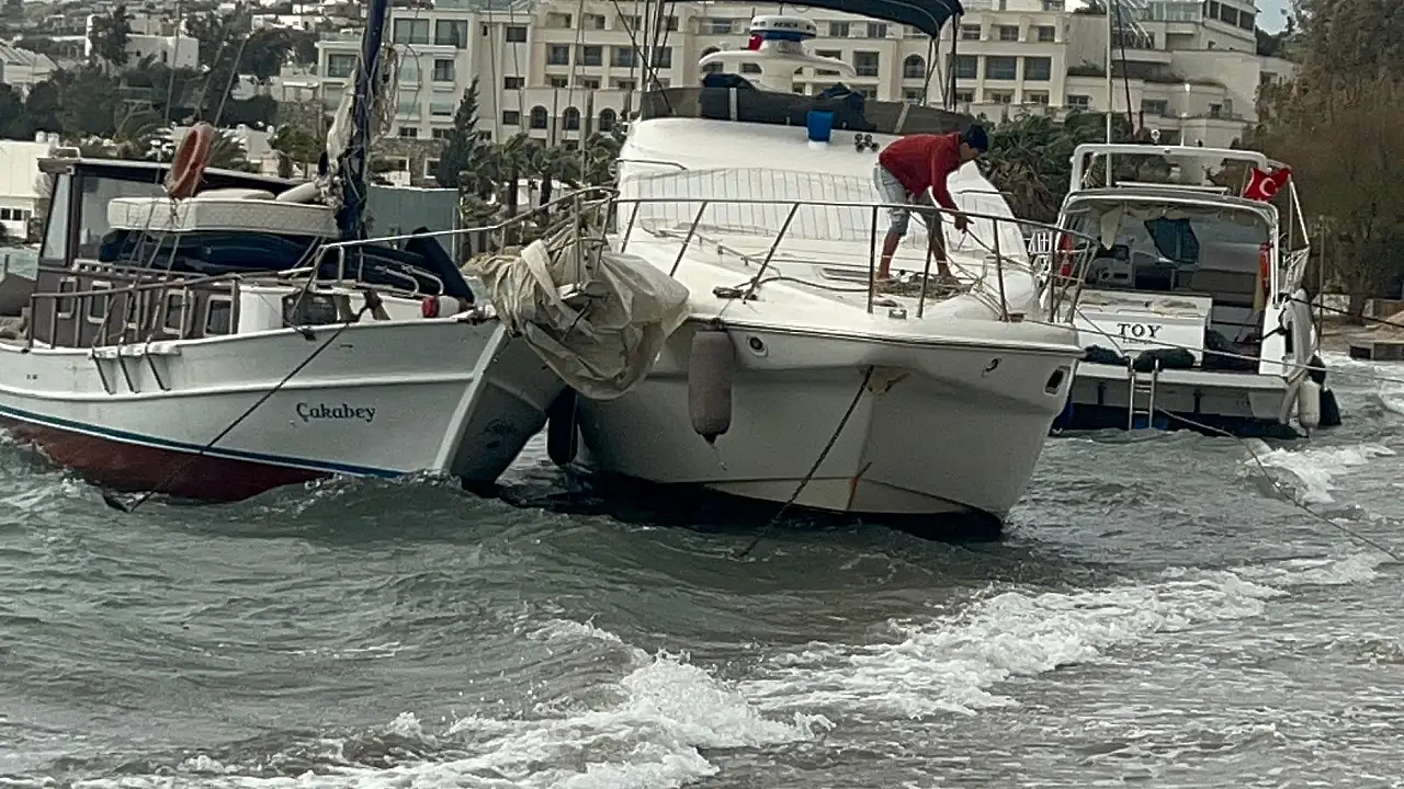 Şiddetli fırtınanın etkisiyle Gümbet Koyu'nda demirli tekneler yerlerinden koparak kıyıya sürüklendi, çarpışma anlarında yaşanan panik ve denizcilerin hasarı önleme çabası kameralara yansıdı.