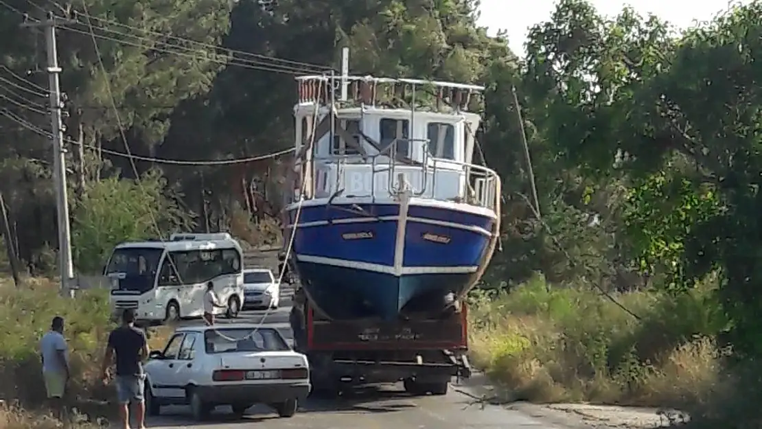 BODRUM HABER - Bodrum'da kamyonla taşınan tekne, elektrik tellerine takıldı.Tellerin koptuğu mahallede elektrik kesintisi yaşandı.
