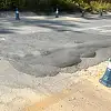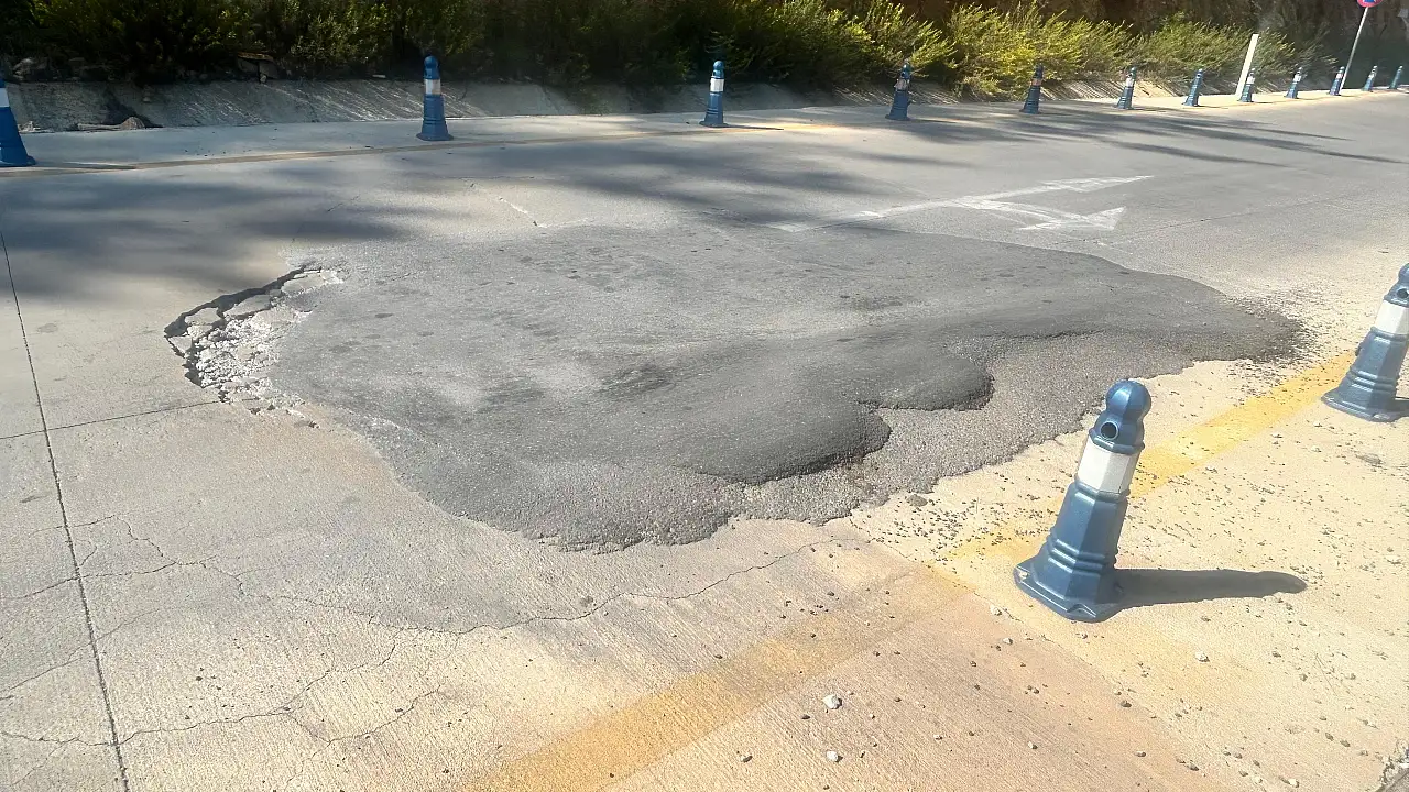 Otogarın giriş kısmında asfaltın defalarca yamalarla düzeltilmeye çalışıldığı, ancak yamaların düzensiz ve üst üste atılması nedeniyle zeminin yeniden bozulduğu görülüyor. Yolda yer yer çökmeler oluşurken, bazı bölümlerde asfalt bir tarafa doğru kabarmış durumda.