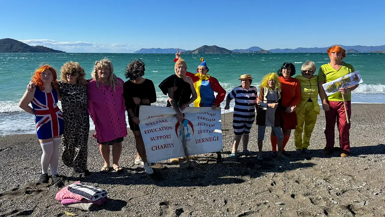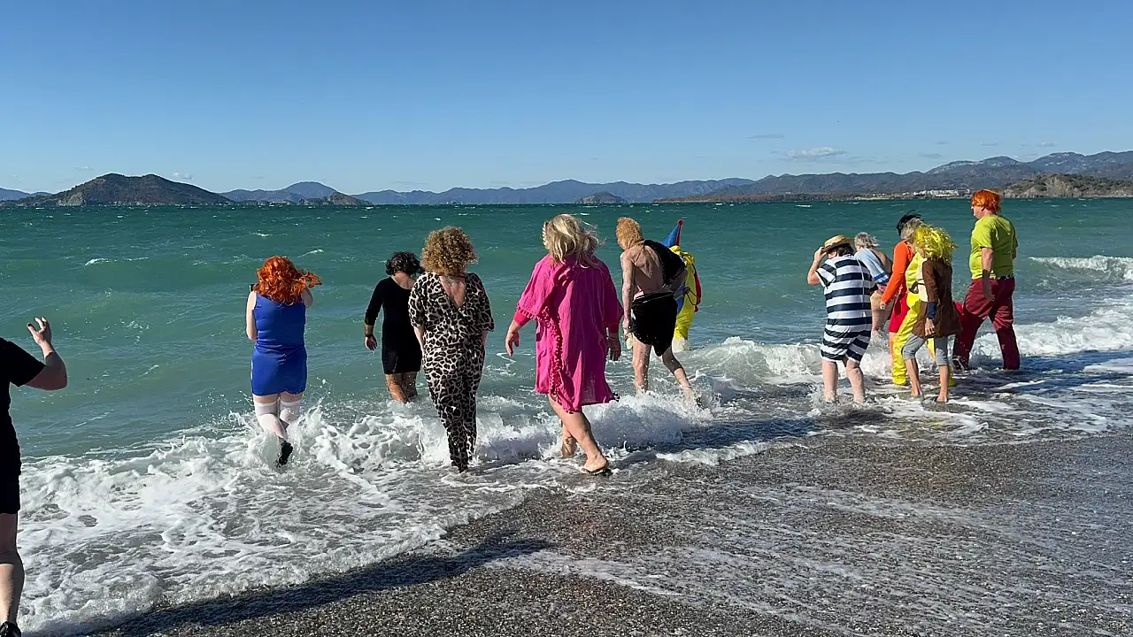 Fethiye ilçesinde yaşayan çoğunluğu İngiliz uyruklu vatandaşlar, yeni yılın ilk gününde Çalış Plajı'nda renkli kostümlerle denize girerek ihtiyaç sahibi çocuklar ve hayvanlar için bağış topladı.