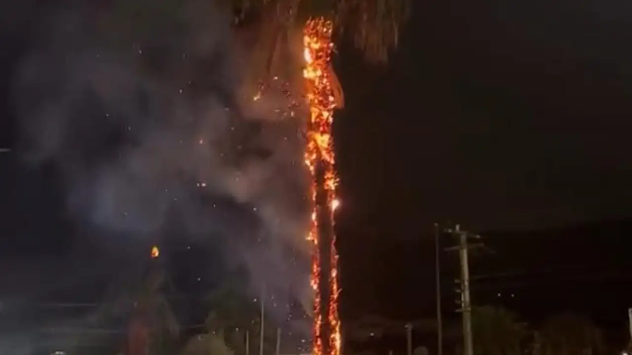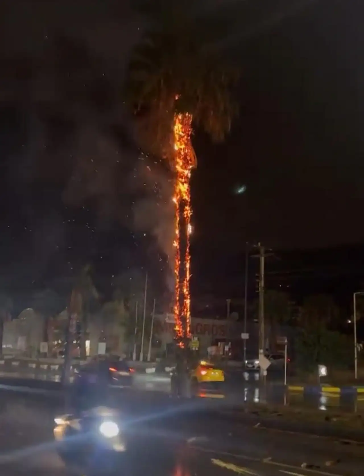 Yıldırım düşmesi sonucu alev alan palmiye kısa sürede yanmaya başladı. Durumu gören vatandaşlar hemen 112 Acil Çağrı Merkezi’ni arayarak itfaiyeye haber verdi.