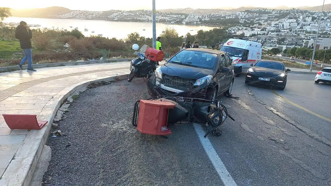 Gümbet Osman Nuri Bilgin Caddesi'nde seyir halinde giden 48 BS 581 plakalı paket servis kurye motosikletinin sürücüsü Remzi G., Değirmenler mevkisinde virajda yağışla kayganlaşan yolda gidon hakimiyetini kaybederek devrildi. Devrilme esnasında sürüklenen yaralı karşı yönden gelen 35 DB 1292 plakalı otomobile çarparak durabildi. gören çevredeki vatandaşlar 112 çağrı merkezine ihbarda bulundu. İhbar üzerine olay yerine gelen 112 acil sağlık ekipleri tarafından ambulansa alınan yaralı Bodrum Devlet Hastanesine kaldırıldı. Kazada her 2 araçta da maddi hasar meydana geldi. Polis kaza ile ilgili soruşturma başlattı.