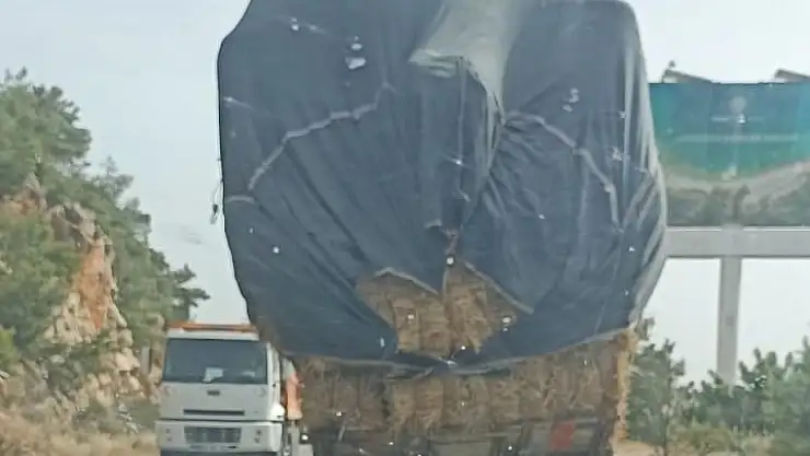 Torba ile Yalıkavak yolu üzerinde seyir halinde olan saman yüklü bir kamyon, taşıdığı yükün dengesizliği nedeniyle trafikte yan şekilde ilerledi.